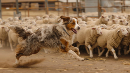 An engaging, wide-angle photograph showcases an Australian Shepherd executing a herding task, guiding a flock of sheep on a sunny ranch.