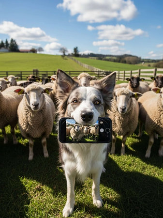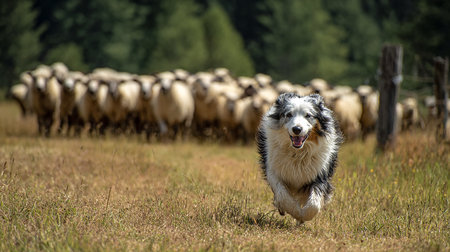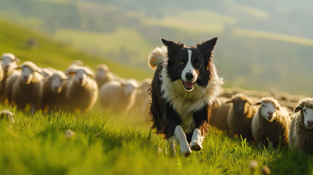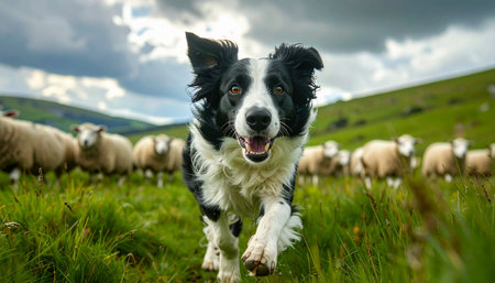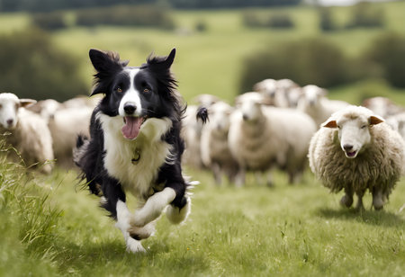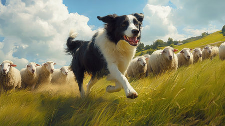 A lively border collie herding sheep in a picturesque countryside setting, showcasing agility and focus