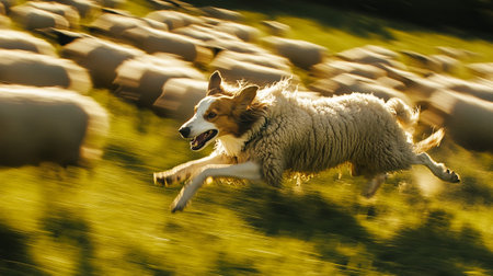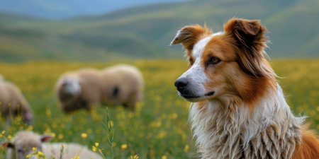 Shepherd dog guarding and leading the sheep flock on a summer day. Generative AI illustration