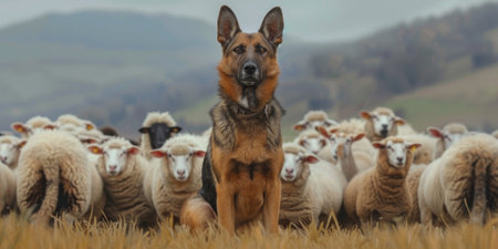 A loyal shepherd dog stands proudly in front of a vast herd of sheep, showcasing strength generated ai