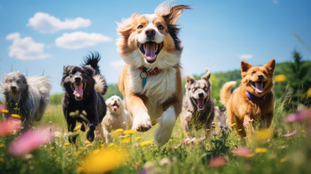 A lively group of dogs of various breeds sprinting joyfully through a vast green field on a sunny day.