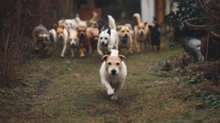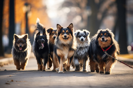 A lively group of dogs joyfully sprinting down a street, filled with energy and excitement, Professional Dog Walkers, Dog Walking Business, Services, AI Generated