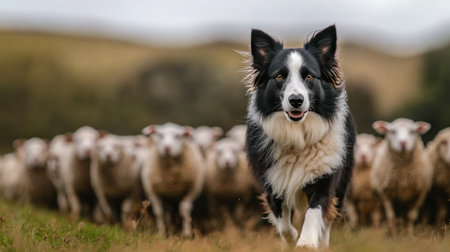With boundless energy and a joyful expression, an intelligent Border Collie expertly guides a flock of sheep across a vibrant green pasture. This dynamic scene captures the pure instinct, skill, and happy dedication of a working dog in its natural element, embodying concepts of leadership, focus, and rural life.