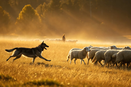 A skilled dog actively guides a flock of sheep through a golden, sunlit field at sunrise. The tranquil atmosphere enhances the beauty of this rural activity in the morning light.
