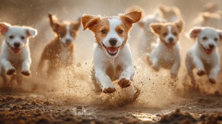 A group of joyful puppies run energetically through a dusty outdoor setting, capturing the essence of playfulness and fun. The scene radiates happiness and companionship.