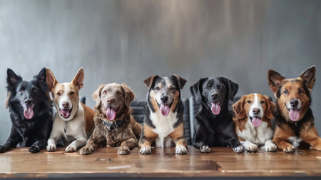 dogs at a meeting. Dogs sit at a long table in the office around long wooden table.