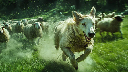 spirited dog races ahead of a herd of sheep, guiding them through the lush fields with energy and determination.