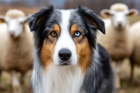 Australian shepherd dog with heterochromia is guarding a flock of sheep in a field