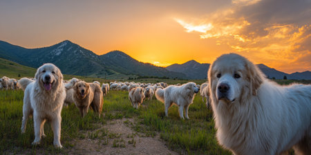 A group of dogs watches over a flock of sheep in a natural outdoor setting. The image showcases white and brown dogs with long fur. The composition includes a path, green grass, mountains and a vibrant sunset with warm tones. This could be used for agricultural or environmental themes.