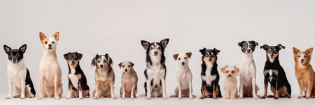 Various dogs of multiple breeds and sizes are sitting closely together, displaying a range of colors and coat types against a light backdrop.