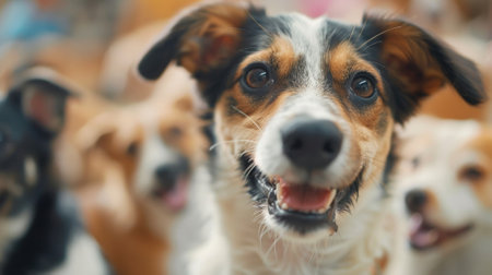 Dogs of different breeds happily gathered together and looking at camera background, - Ai Generated