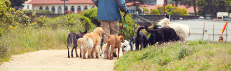 Diverse pack of happy dogs husky, border collie, golden retriever and friends walking together on a sunny park path amid trees, playful and full of joy