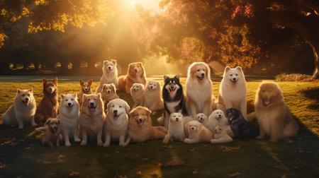 Multiple dogs of different breeds are gathered together, showing their happy expressions in a vibrant park under clear skies. Their fur colors vary, adding charm to the joyful moment.