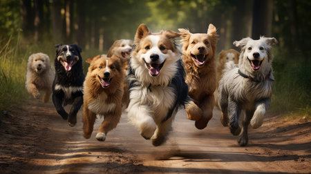 A lively group of dogs joyfully sprinting down a street, filled with energy and excitement, Professional Dog Walkers, Dog Walking Business, Services, AI Generated