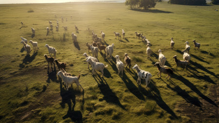 Herd of goats grazing on a meadow in the morning light