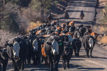 OCTOBER 2017, Ridgway, Col.orado: Cowboys on Cattle Drive Gather Angus/Hereford cross cows and calves of Double Shoe Cattle Company, Centennial Ranch, San Juan Mountains