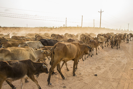 Cows on the road in the countryside, Thailand. Vintage style.