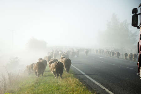 New Zealand merino sheep on the highway, stopping the heavy trucks in the misty morning