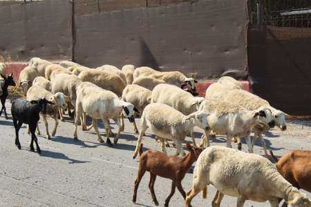 Nice flock of sheep and goats led by the shepherd through roads and highways to the fields to graze
