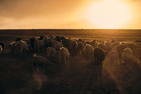 Flock of sheep grazing in sunset. Sunlight is used as backlit.