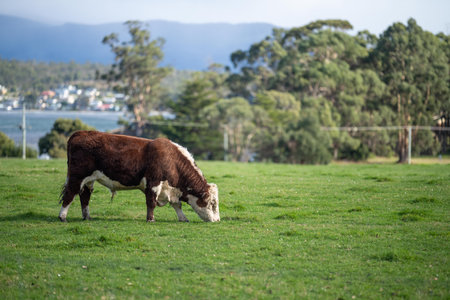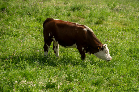 Hereford Cow Grazing with head down while facing left . Pictured from shoulders down