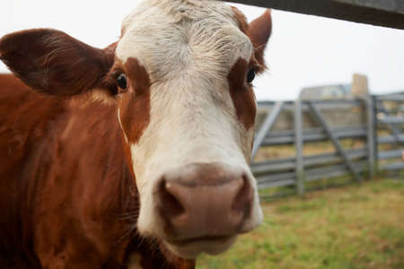 Red Cow standing in the paddock in farm looking into the frame, close-up