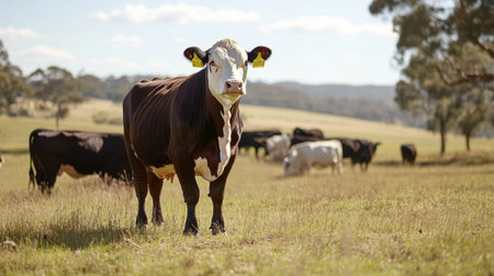 A close-up view of a brown and white cow standing in a lush green pasture, with other cows grazing peacefully in the background under a bright sky.