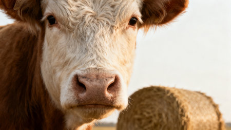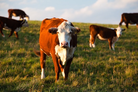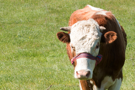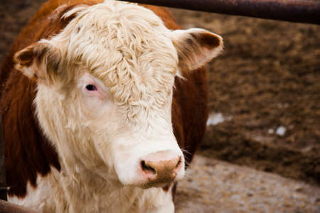 Young Chandler Herefords cow Portrait. Brown and white paint cow. Cute Orange cow with white head