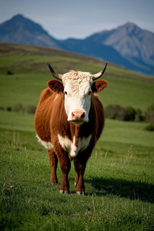 A solitary cow stands majestically in a sunlit field, surrounded by lush green grass and a clear blue sky. Ideal for agriculture and nature themes.