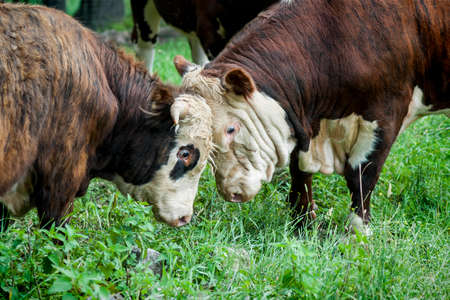 A herd of cows grazes in a meadow and eats green grass. Pets.