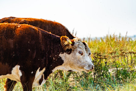 Cow caught in a dense swarm of flies while grazing. . High quality photo
