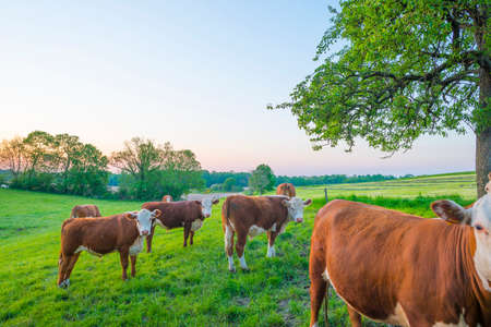 Cows in a green hilly meadow under a blue sky in sunlight in springtime, Voeren, Limburg, Belgium, June, 2021