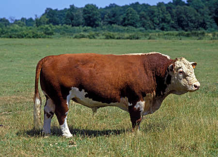 HEREFORD CATTLE, BULL STANDING IN PASTURE