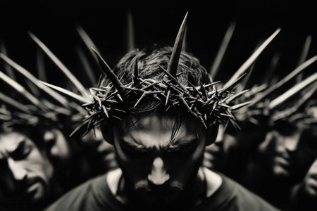A thoughtful man wearing a crown of thorns, expressing deep emotion against a dark background, capturing themes of suffering and redemption in a dramatic black and white style