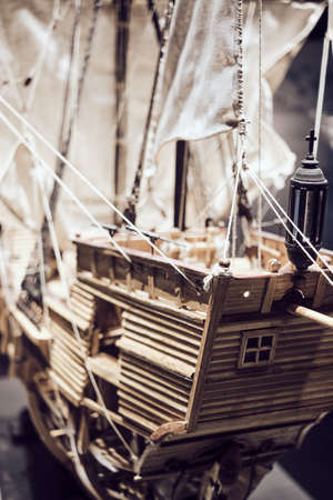 close up of nautical old ship model reproduction miniature of galleon.
