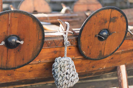 Rope fender and shields on a viking ship replica.