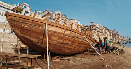 Varanasi, Uttar Pradesh, India. Indian men Workers are repairing and making a wooden boat on the Ganges river embankment. Boating is a popular activity for tourists and pilgrims.