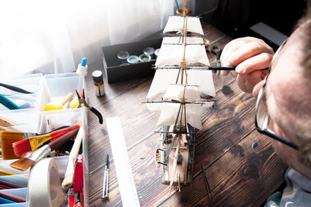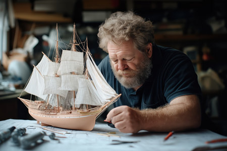 A craftsman focuses intently on assembling a model ship in his cluttered workshop. Surrounded by tools he carefully works on intricate details showcasing his dedication and craftsmanship.