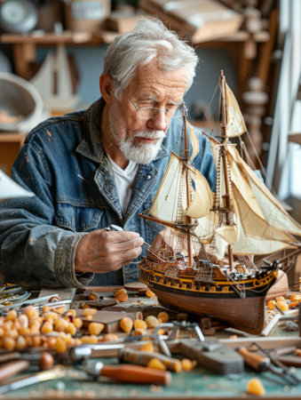 Senior man working on a model ship in his workshop, detailed focus, tools and parts around, hobby passion