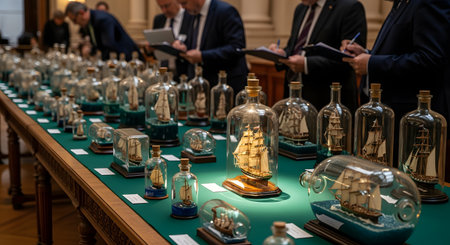A panel of serious judges is shown carefully inspecting and scoring a large collection of intricate ship-in-a-bottle models during a competition or exhibition. The judges are focused, taking notes, while one uses a magnifying glass to examine the fine details of the craftsmanship. The scene captures the dedication and high standards of this unique hobby.