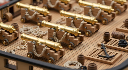 A close-up, detailed view of the deck of a historic model sailing ship. Rows of miniature brass cannons are mounted on wooden carriages, complete with ropes, barrels, and an anchor, showcasing incredible craftsmanship and historical accuracy.