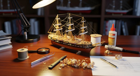 A detailed wooden model of a historic sailing ship sits on a desk, a work in progress for a dedicated hobbyist. The scene is filled with crafting tools like a magnifying glass, tweezers, glue, and wood shavings, all illuminated by a warm desk lamp. The image represents patience, precision, hobbies, and the art of model building.