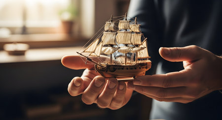 A close-up shot of a man's hands gently cupping a small, intricate model of a tall sailing ship. The detailed wooden ship has multiple masts and full sails. The background is softly blurred, focusing on the concepts of care, craftsmanship, and hobbies.