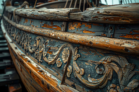 A closeup of a boats wooden hull, with intricate carvings and weathered paint, showcasing the beauty and history of the craft