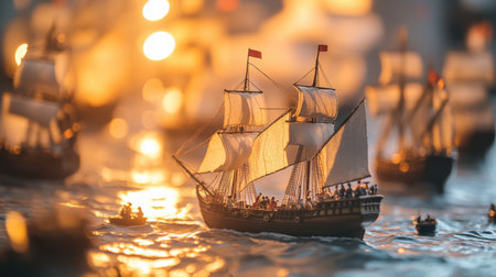 Tiny figures aboard Columbus's ships journey across the illuminated waters, capturing the historic moment of exploration toward the New World with intricate detail.