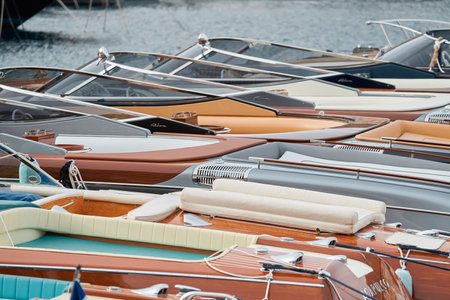 Monaco, Monte Carlo, 29 September 2022 - Few luxury retro motorboats Riva in a row at the famous motorboat exhibition in the principality, elegance boats for rich clients
