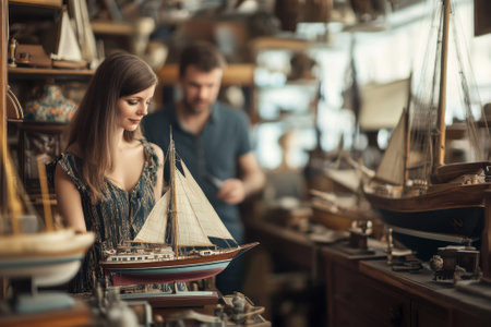 A woman explores a vintage shop, captivated by an intricate model sailboat while a man browses nearby.