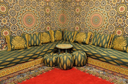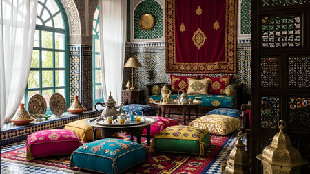 Interior of a beautiful room with luxurious decor and vibrant colors. The room features intricate tile work, colorful cushions, and ornate decorations.