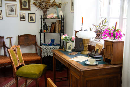 Litomysl, Czech Republic, 17 April 2022: castle chateau interior with baroque classic furniture, wooden writing desk and chair near windows, portrait of Elizabeth of Bavaria, lamp with green shade