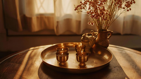 Golden hour light illuminates brass candles and dried flowers on a wooden table. A peaceful and serene scene.